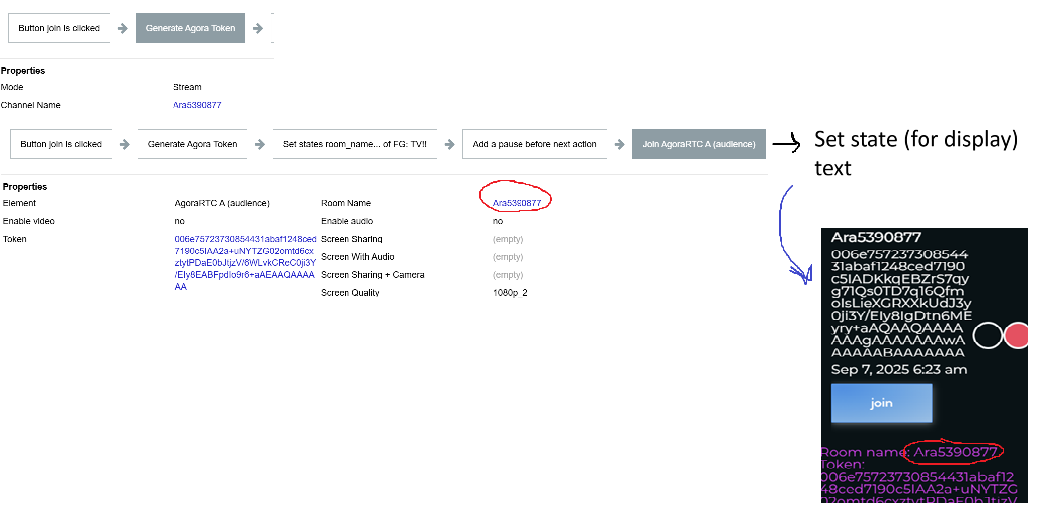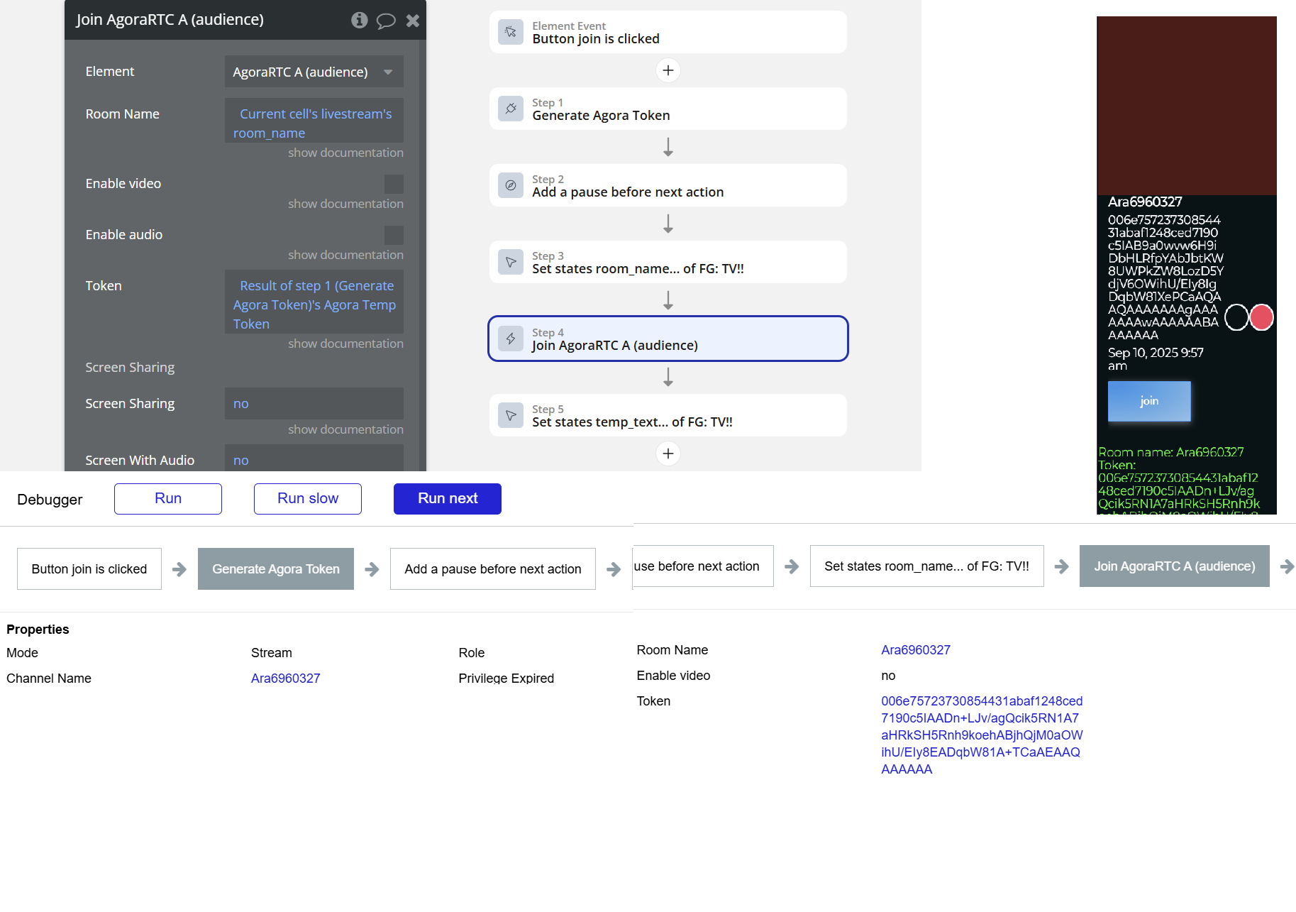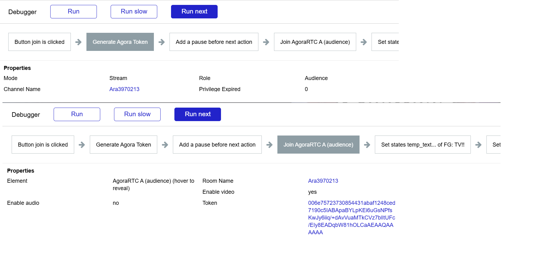 Starting the stream is fine, the camera shows after getting the token and joining the stream. Every time I have it set to create a new stream and give it a room name (name and numbers) and then also save the token. I can join the stream fine using this as a host. However, for some reason when trying to join as audience nothing shows on the audience Agora. I checked and both are joining the same room name and with their own token, and it does say connected. See workflows: