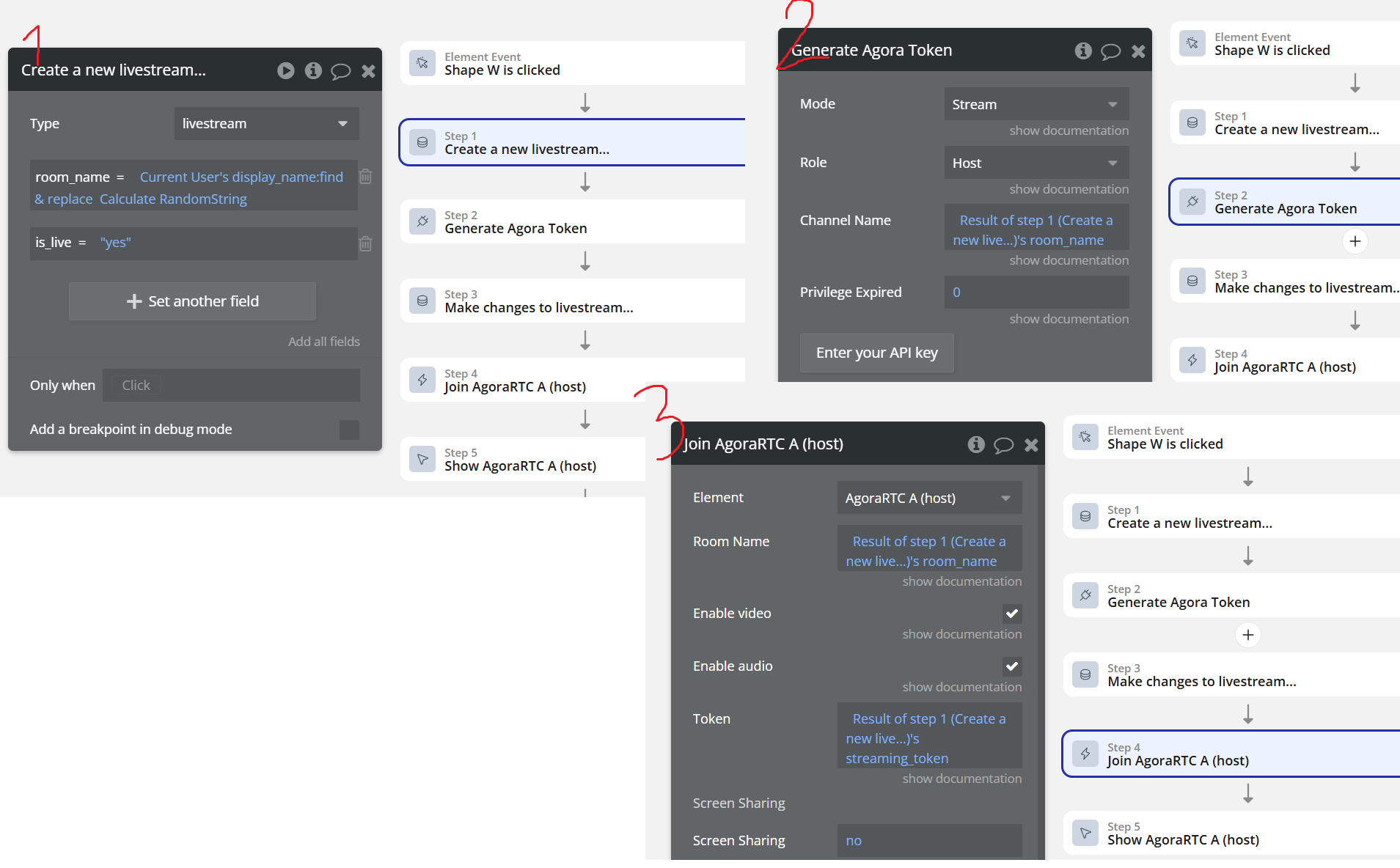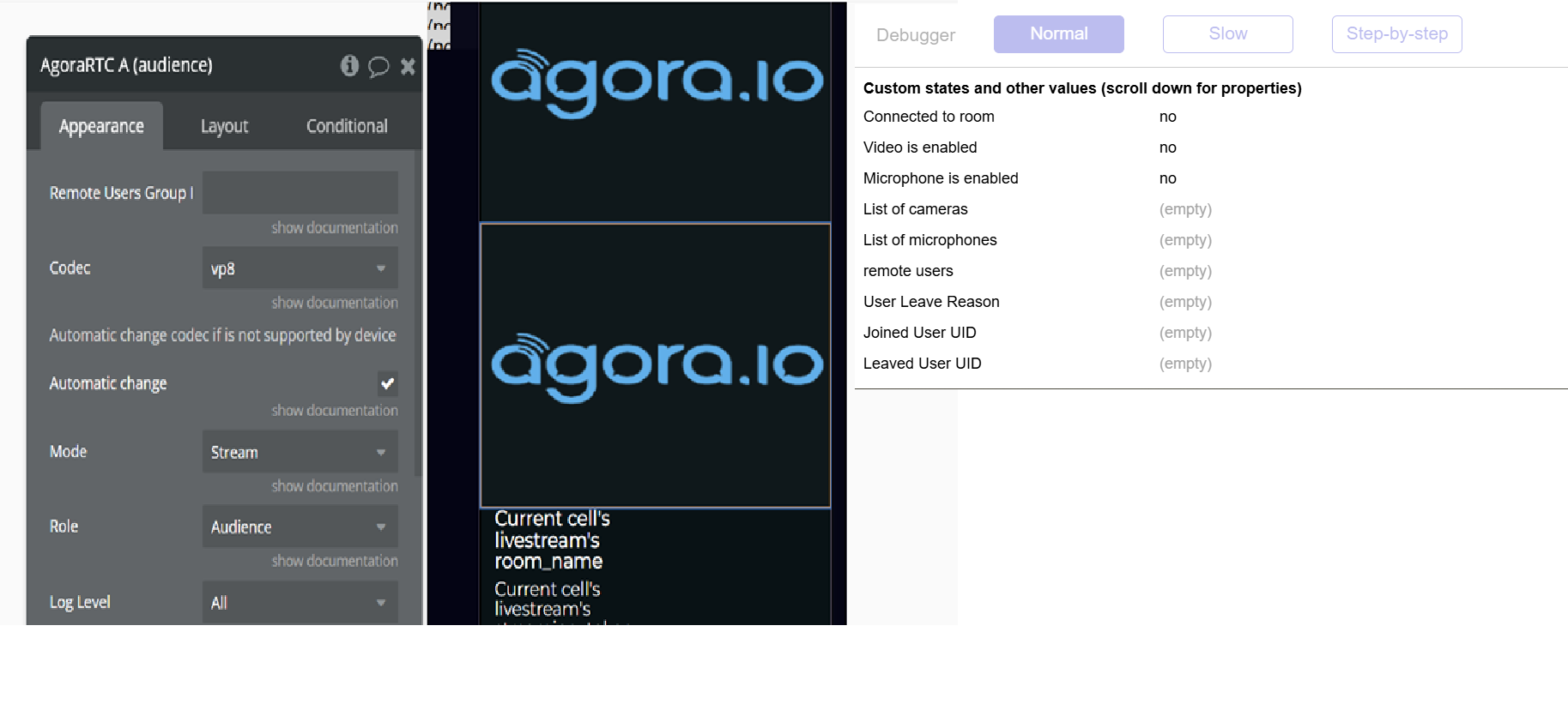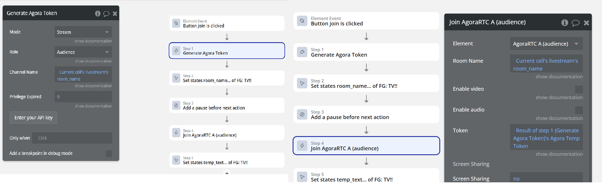 Starting the stream is fine, the camera shows after getting the token and joining the stream. Every time I have it set to create a new stream and give it a room name (name and numbers) and then also save the token. I can join the stream fine using this as a host. However, for some reason when trying to join as audience nothing shows on the audience Agora. I checked and both are joining the same room name and with their own token, and it does say connected. See workflows: