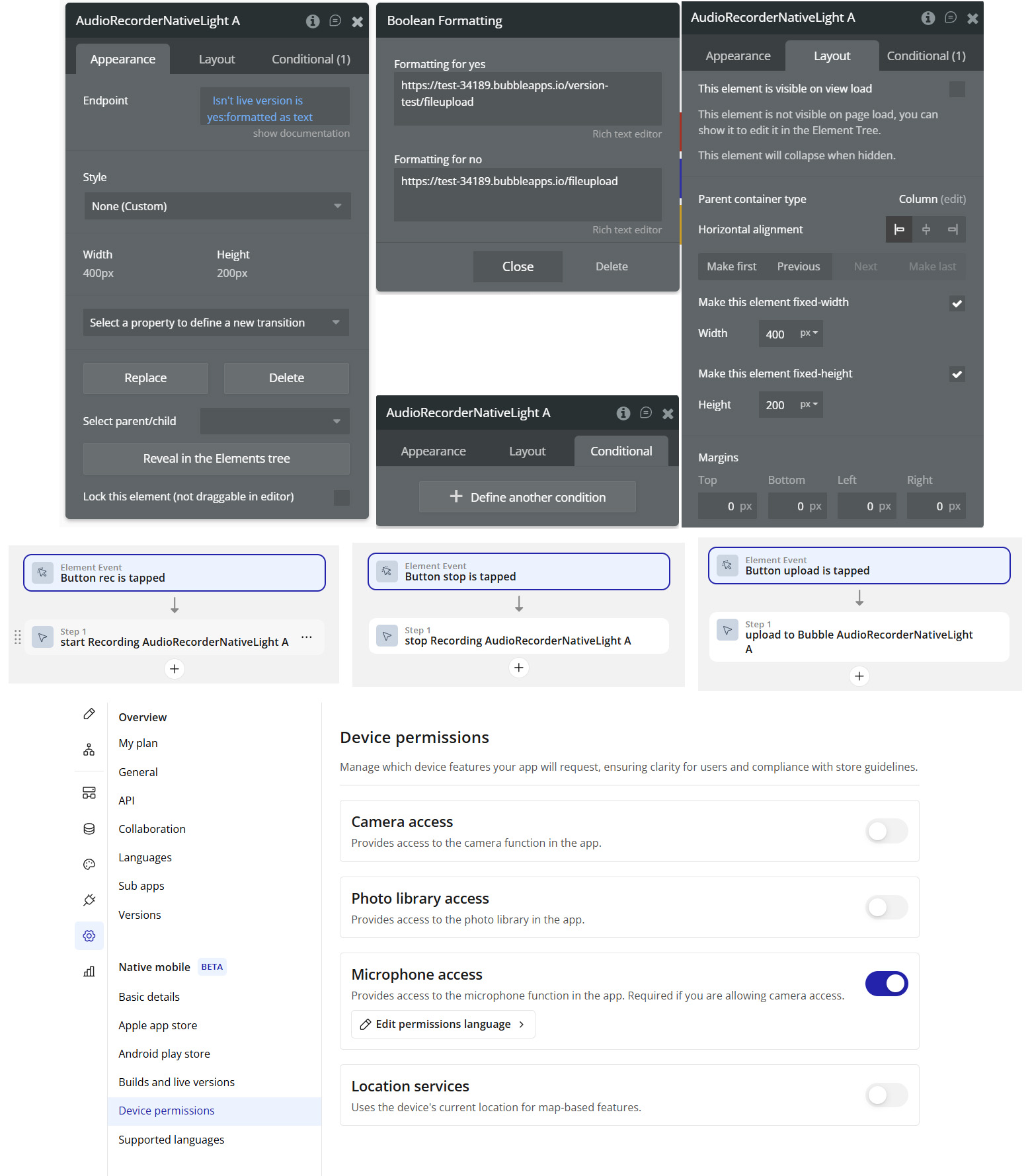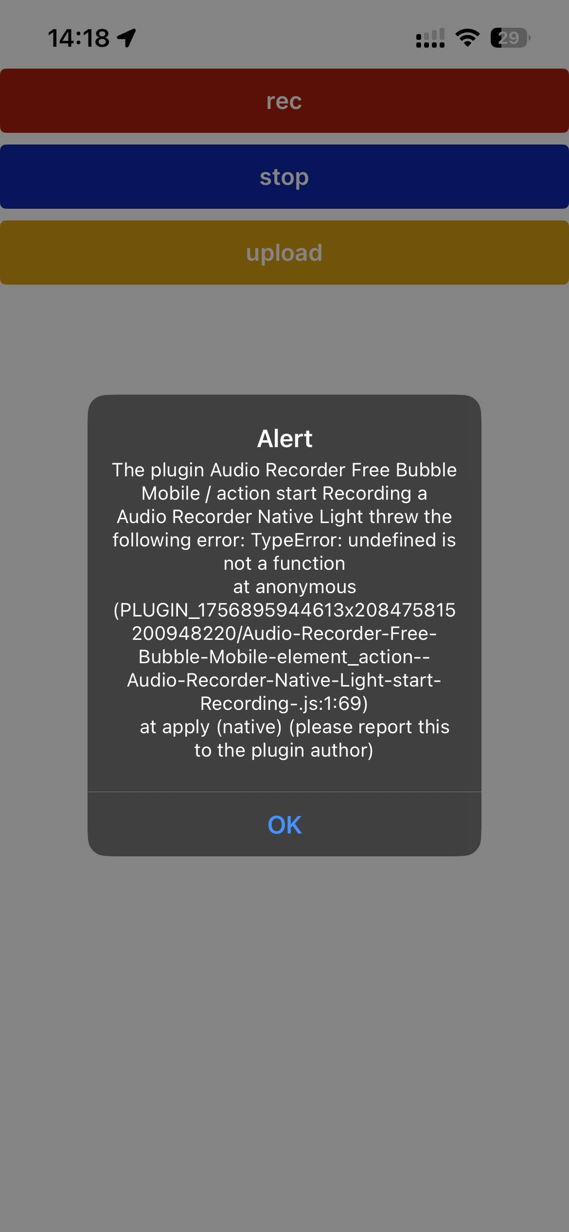 “Action start Recording AudioRecorderNativeLight A The plugin Audio Recorder Free Bubble Mobile / action start Recording a Audio Recorder Native Light threw the following error: TypeError: instance.data.startRecording is not a function at eval (PLUGIN_1756895944613x208475815200948220/Audio-Recorder-Free-Bubble-Mobile-element_action–Audio-Recorder-Native-Light-start-Recording-.js:3:15) at https://test-34189.bubbleapps.io/package/native_web_js/b63a58ac95c273524e53a05d7dbf340a2636c28c2de87f3ab6938191688cab88/native_web.js:2997:3262 (please report this to the plugin author)”