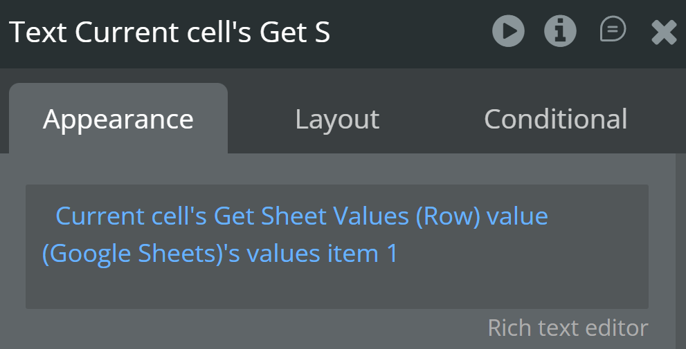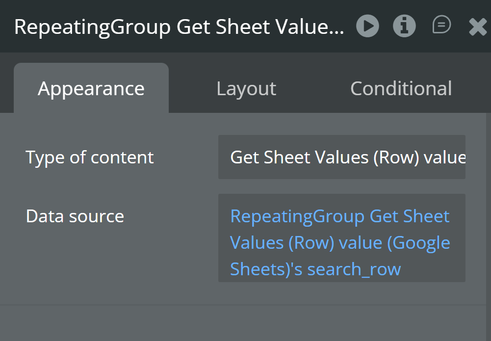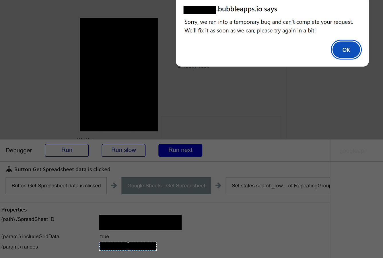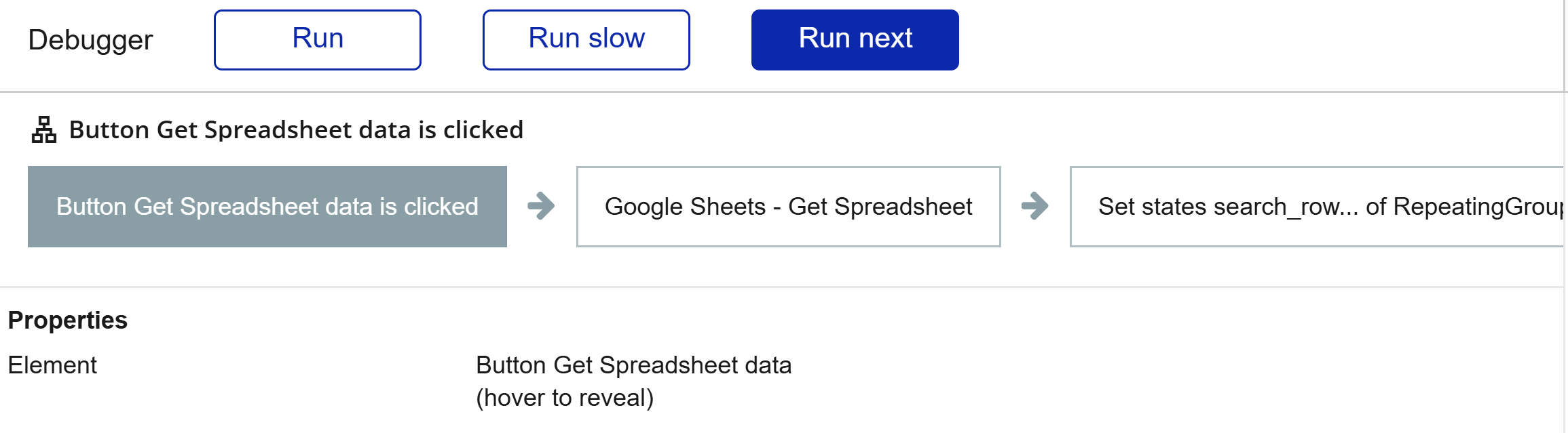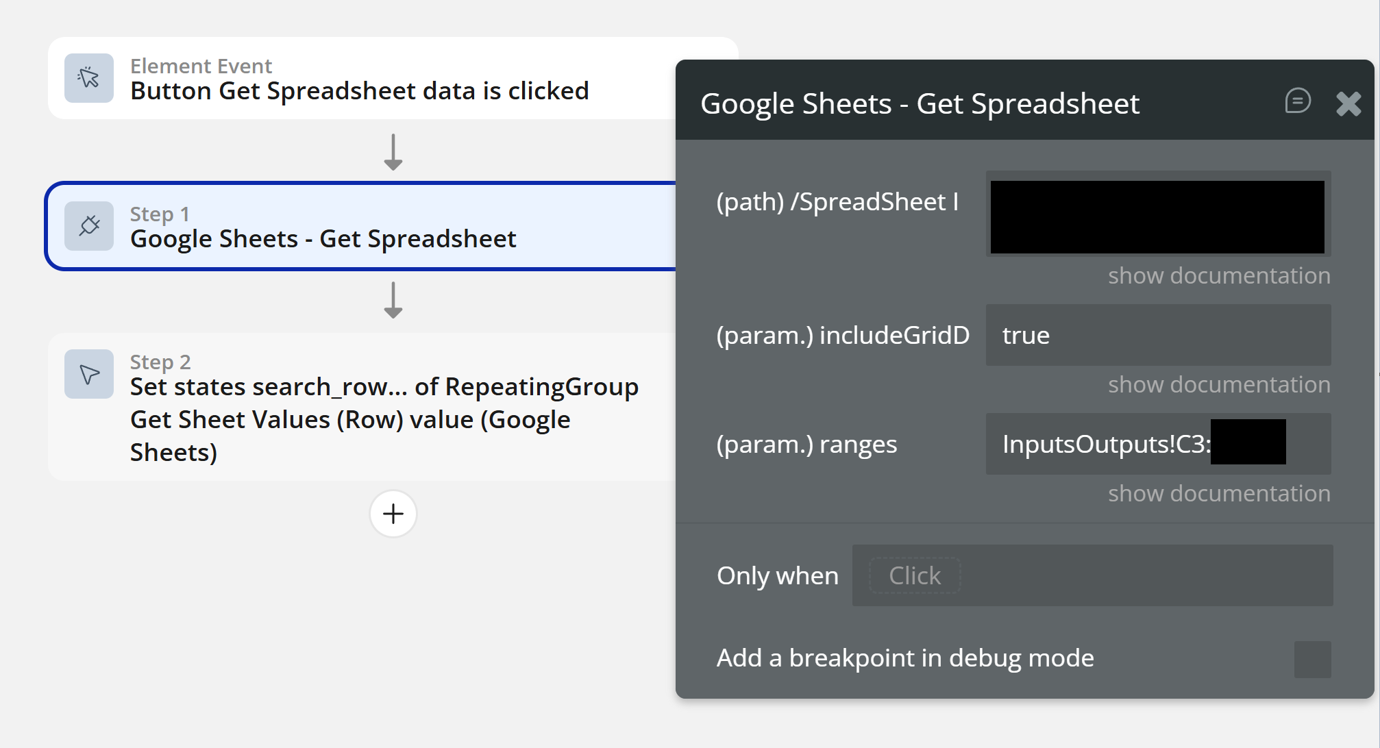 I am trying to pull data from a cell in google sheets and have the plugin and API key set up. I am looking at the example bubble.io webpage and copied the workflow in button search row as well as the repeated group with the states in the design but am having trouble getting it to work.