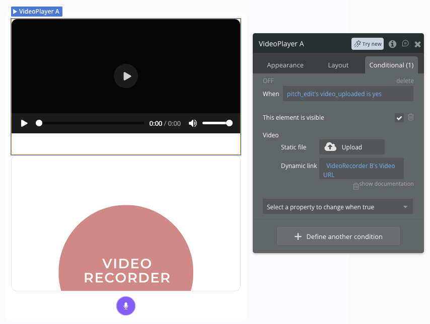 The VideoPlayer source is set via a Conditional: when video_uploaded = yes → show element + set Dynamic link to Current page’s Pitchprofil’s pitch_video_url.