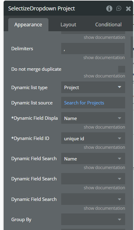 - Selectize → Repeating Group Settings: